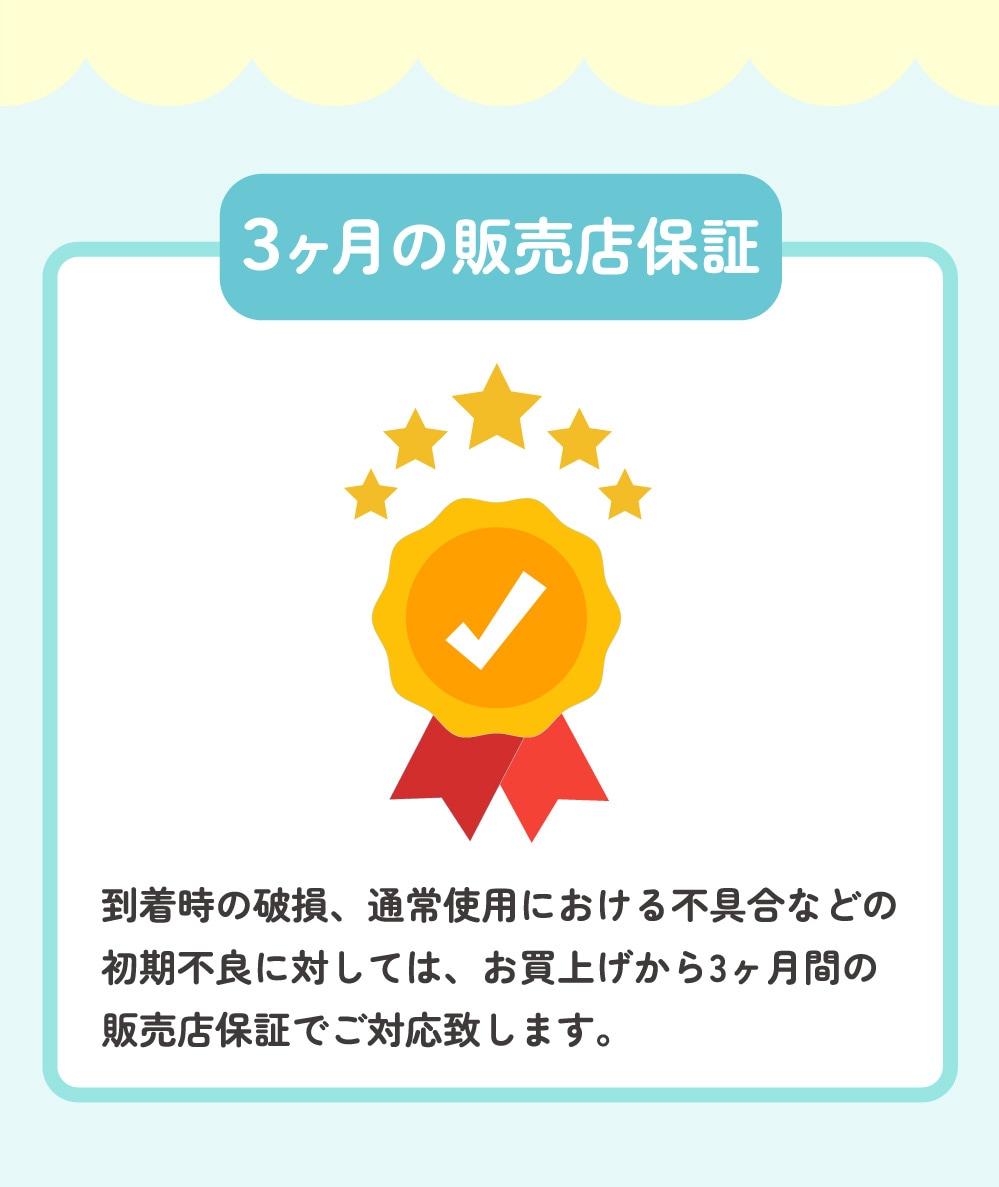楽しいおもちゃを安心して使っていただきたいから、ピタパレだけの独自の販売店保証をご用意しています。お買い上げから3か月の販売店保証で、通常使用の範囲内で発生した不具合、お届け時の破損や初期不良等に迅速に対応いたします。