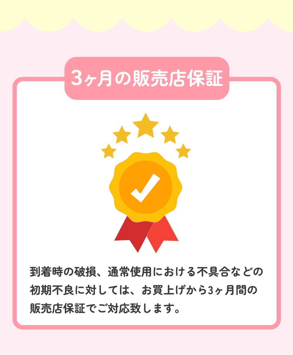 楽しいおもちゃを安心して使っていただきたいから、ピタパレだけの独自の販売店保証をご用意しています。お買い上げから3か月の販売店保証で、通常使用の範囲内で発生した不具合、お届け時の破損や初期不良等に迅速に対応いたします。