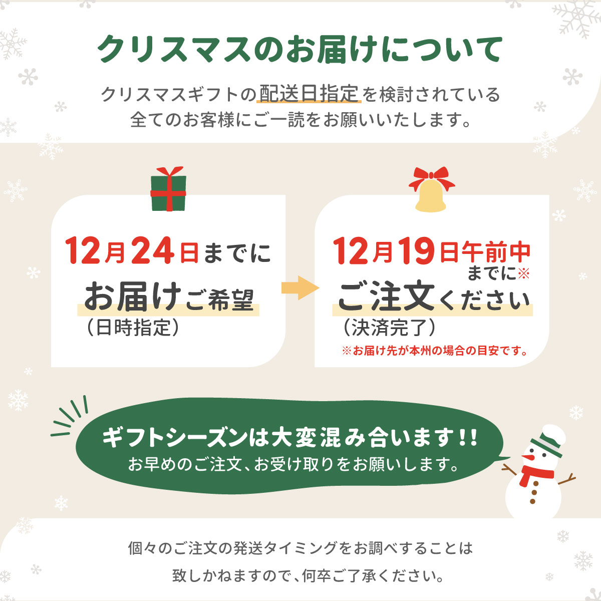 12月24日までにお届け希望の場合は、12月19日(午前中)までのご注文をお願いします。