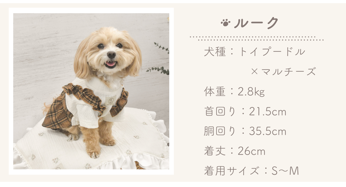 お手元にわんちゃんにとって着心地の良いサイズの服があればそちらの寸法を測っていただき、商品寸法と比較していただくこともおすすめです。